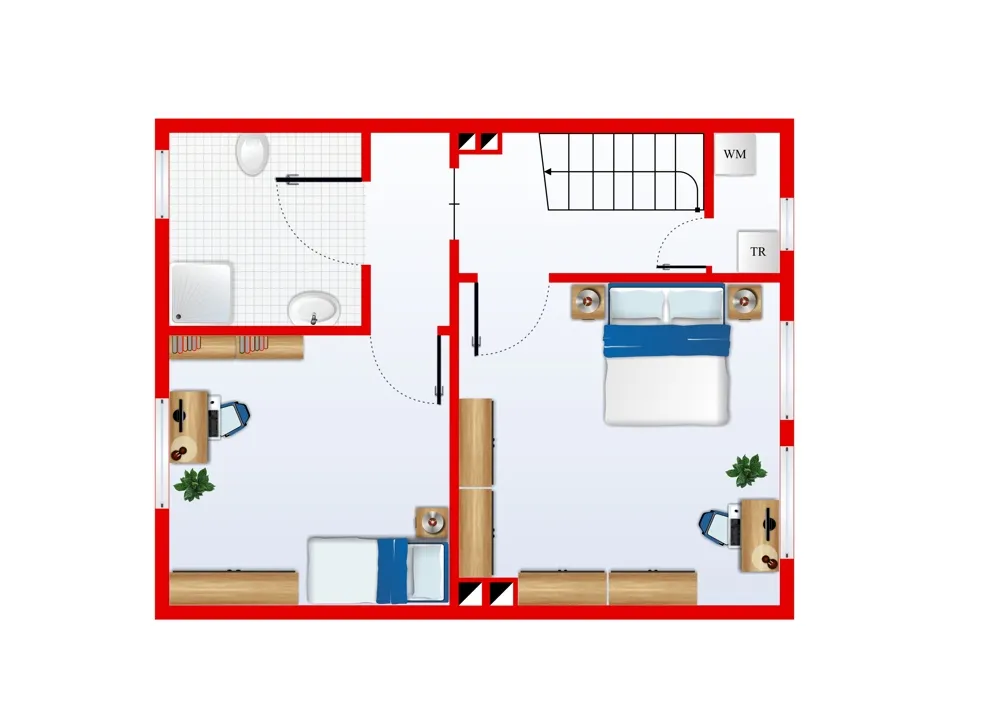 Im 1. Obergeschoss befinden sich ein kleiner und ein großer Schlafraum sowie das neue großzügige Duschbad. Aus dem alten Bad ist ein praktischer Hauswirtschaftraum geworden. Das neu ausgebaute Dachgeschoss bietet über eine recht steile Treppe mit seinen neuen großen Veluxfenstern einen weiteren großen Wohn-/ Schlafraum zum Relaxen.