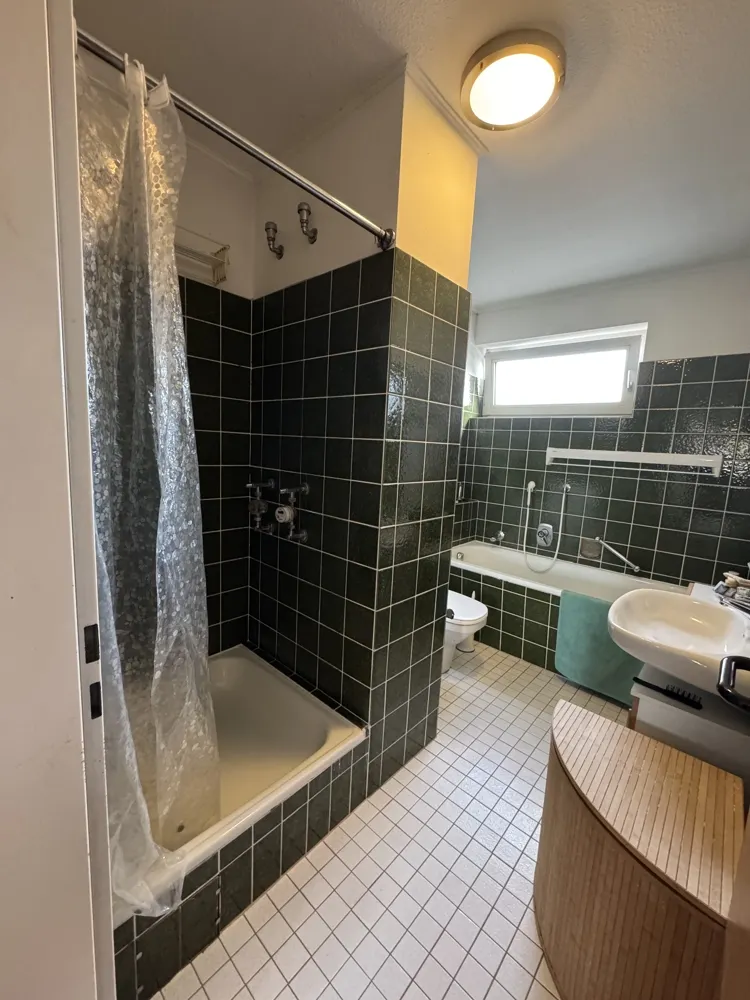 - Badezimmer mit WC, Dusche- und Badewanne und Fenster